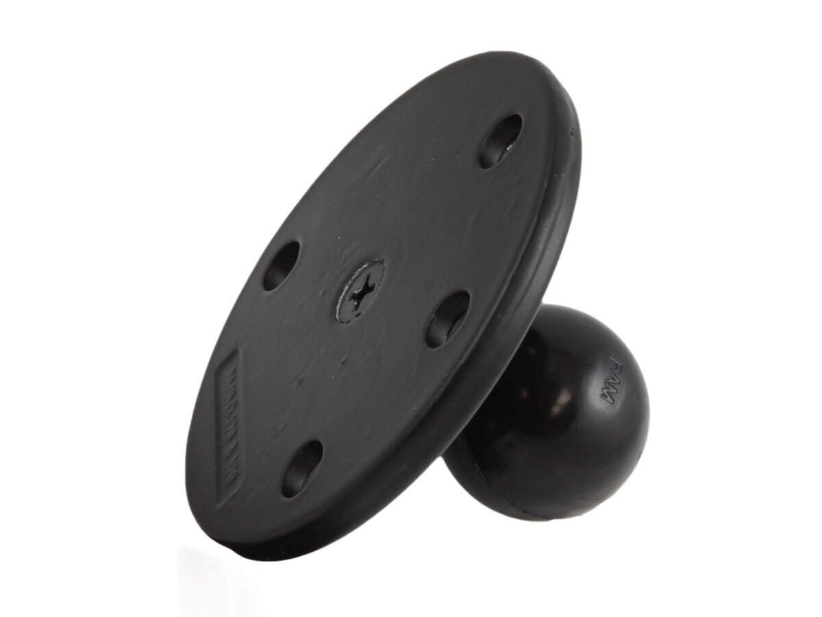 The RAM-240U consists of a steel reinforced 1.5" diameter rubber ball connected to a flat 3.68" diameter base. This base has 3-hole 120 degree pattern pre-drilled holes that connects to RAM Tough-Dock Powered Docking Stations.