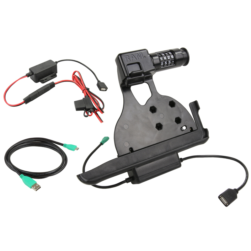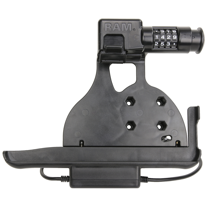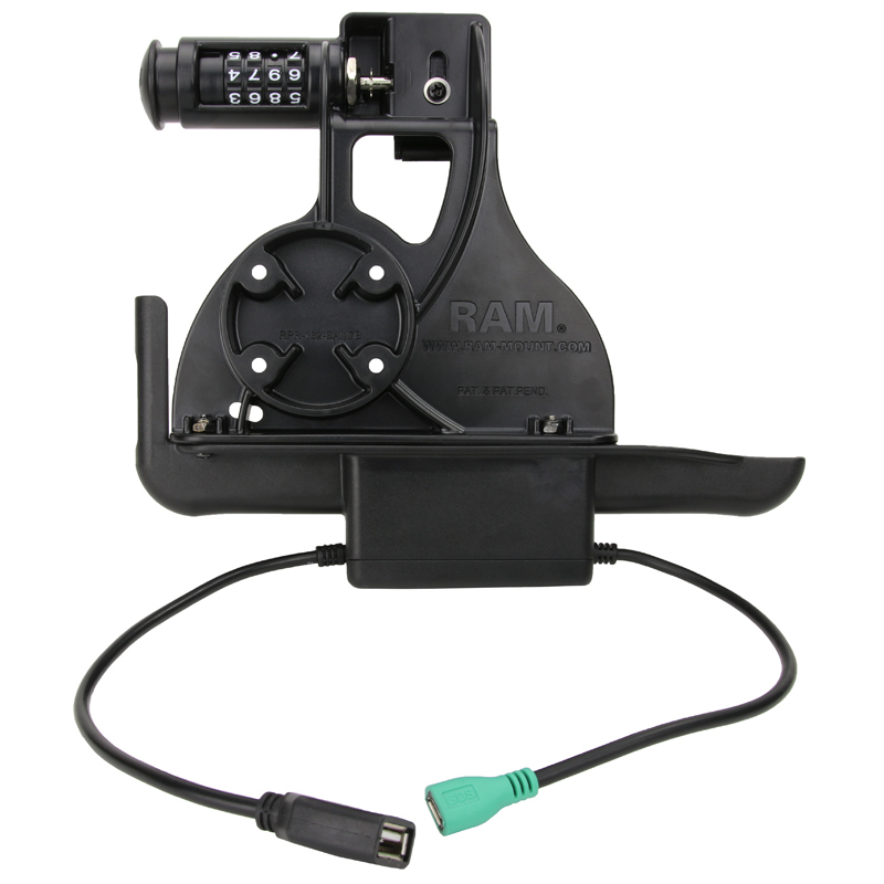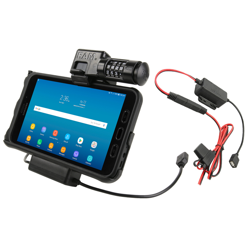 This RAM EZ-Roll'r powered cradle for the Samsung Tab Active2 supports simultaneous data syncing, and has been designed to meet the demands of field workers in a variety of applications including transportation, field sales, logistics, manufacturing, and much more. Power and data sync capabilities are provided to the device through seven GDS pogo pins, and you can easily rotate the device for use in portrait or landscape mode. For security and theft deterrence, the RAM-HOL-SAM7PCL2-HARU features a patent pending dial combination lock. Unique features include access to the NFC reader while in the cradle for scanning NFC tags as well as the stylus. Included is a set of four nuts and bolts to connect the cradle to any RAM components containing the universal AMPS hole pattern. Also included is the GDS modular hardwire charger, GDS genuine USB 2.0 straight cable, 200mm cable with mUSB female connector for power, and 200mm cable with USB Type-A female connector to attach any USB 1.1 peripherals, 500mA max.