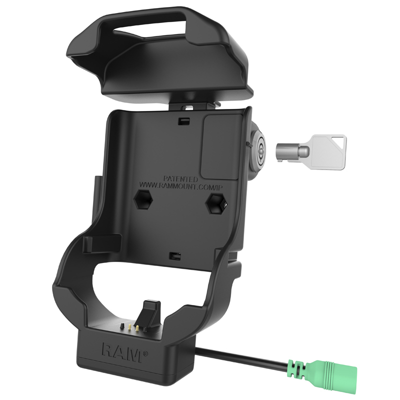 This locking, spring-loaded cradle with stylus holder allows you to secure your Zebra TC70, TC72, TC75, or TC77 with or without the Zebra Handstrap accessory. To lock, simply insert the device and push the button. The cradle is compatible with RAM two-hole AMPS pattern diamond bases that will connect to B and C size ball mounts, allowing for a wide variety of mounting options (hardware included). For charging capabilities, take advantage of the RAM-GDS-CHARGE-V7-M55U for hardwire applications or the RAM-POW-CIG-M55 cigarette charger. Includes a cable with a DC power jack.